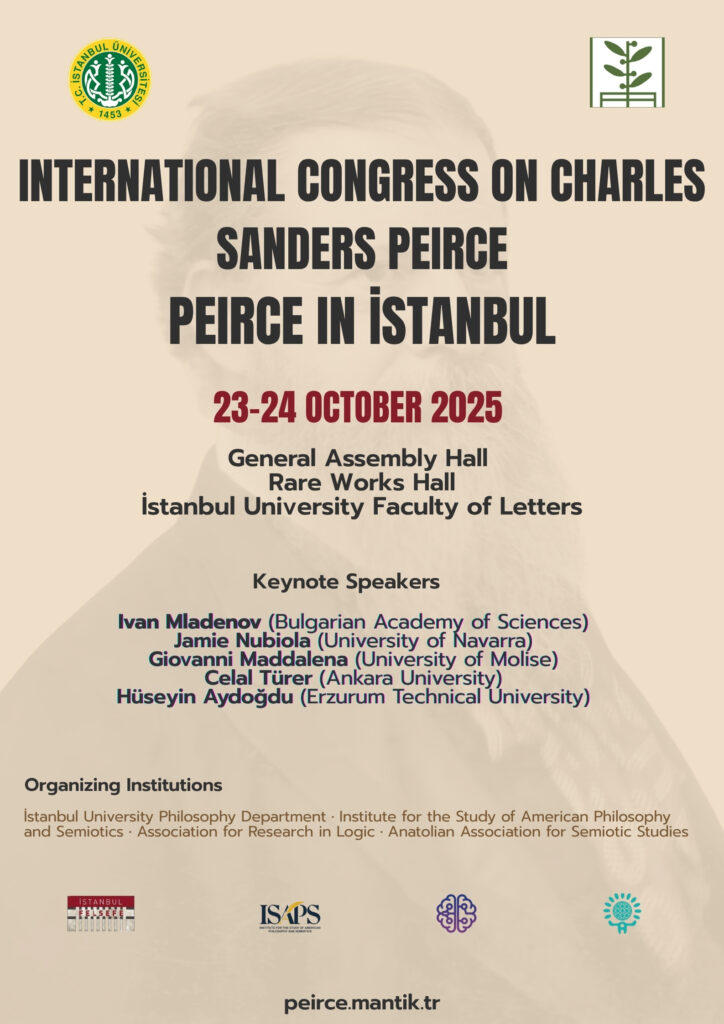 We are pleased to announce the International Congress on Charles Sanders Peirce: Peirce in İstanbul, which will be held on October 23-24, 2025. This event is organized by the İstanbul University Faculty of Letters Philosophy Department, Institute for the Study of American Philosophy and Semiotics, Association for Research in Logic, and Anatolian Association for Semiotic Studies.