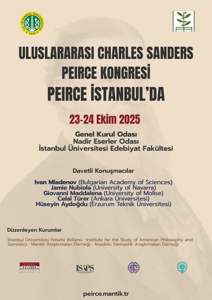 İstanbul Üniversitesi Edebiyat Fakültesi Felsefe Bölümü, Institute For The Study Of American Philosophy and Semiotics, Mantık Araştırmaları Derneği ve Anadolu Semiyotik Araştırmaları Derneği olarak, 23-24 Ekim 2025 tarihlerinde ünlü Amerikalı filozof Charles Sanders Peirce‘ün çalışmalarını kapsamlı bir şekilde tartışmayı amaçlayan Uluslararası Charles Sanders Peirce Kongresi: Peirce İstanbul’da etkinliğini düzenlemekten büyük mutluluk duyuyoruz.